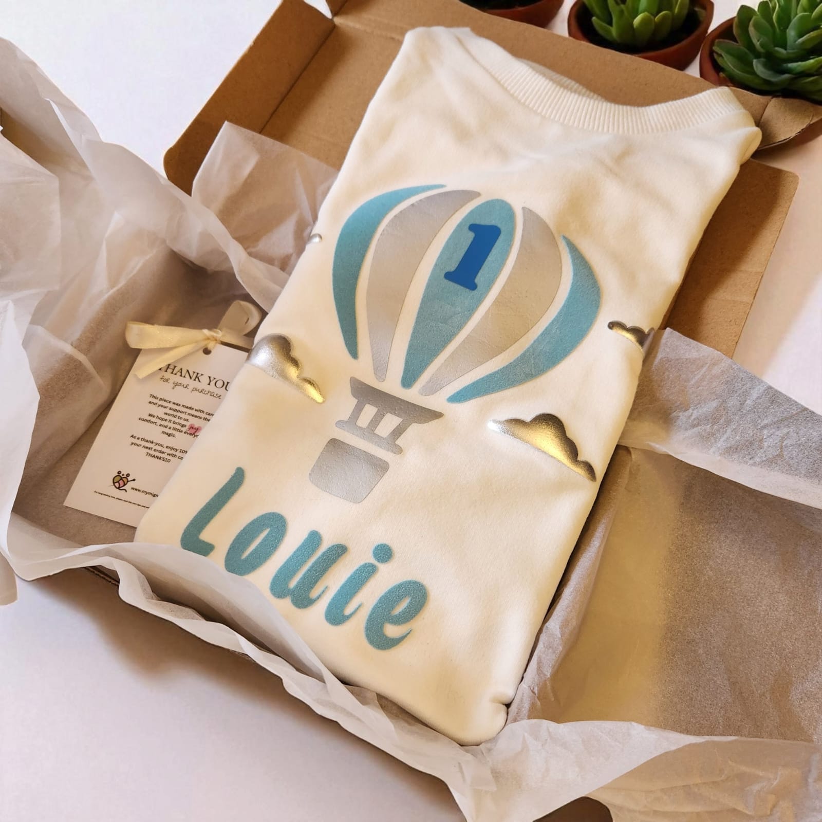 It's perfect to celebrate your little one’s big milestone with this adorable personalised first birthday romper! Featuring a soft white cotton long-sleeve bodysuit and a charming hot air balloon design with a big “1” (or without number) and your baby's name in lovely blue hues — it's the perfect outfit for first birthday parties, cake smashes, or keepsake photos.